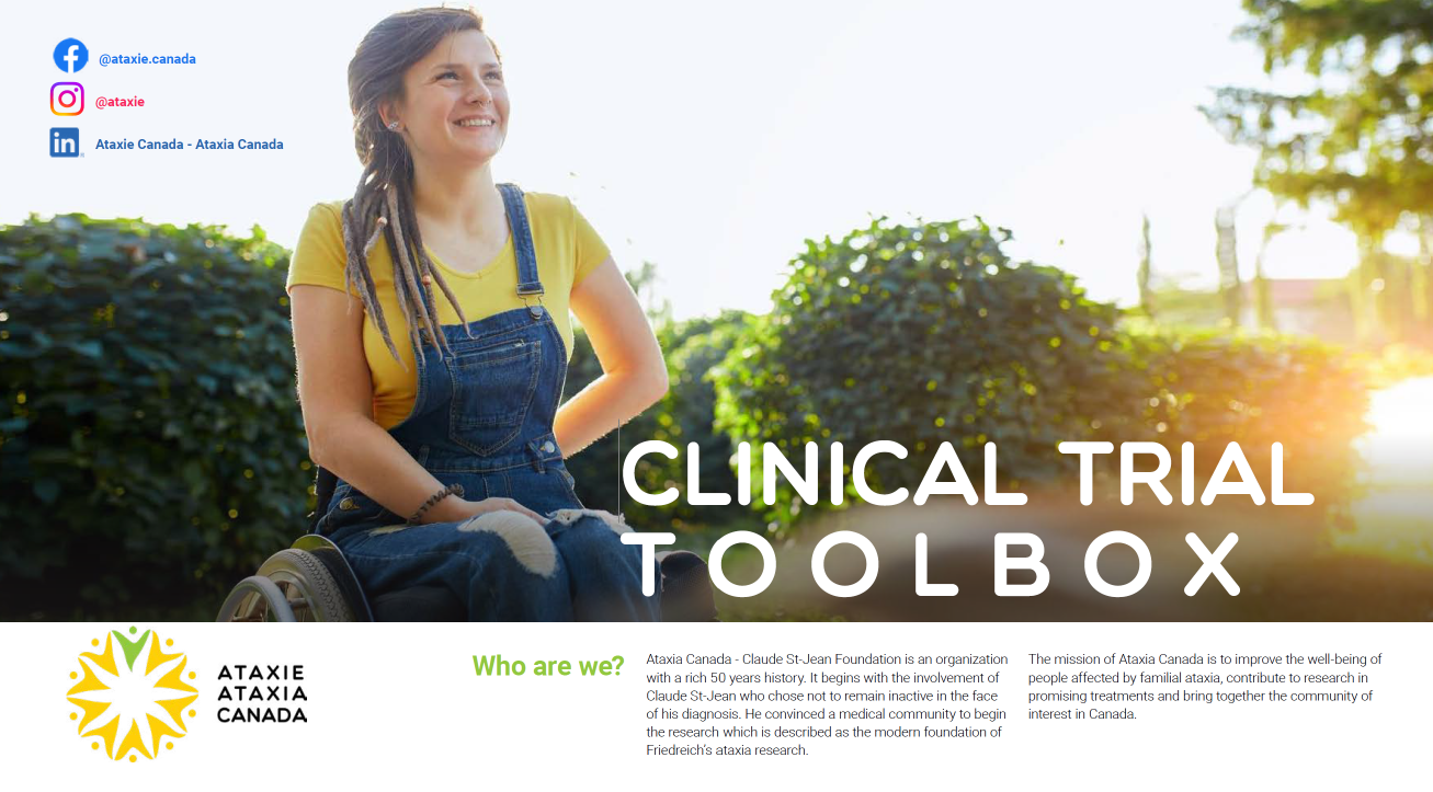 Navigating the world of clinical research can feel overwhelming — but you don’t have to do it alone. Ataxia Canada created the Clinical Trial Toolbox to empower individuals affected by ataxia with the knowledge needed to make informed decisions about participating in clinical trials.